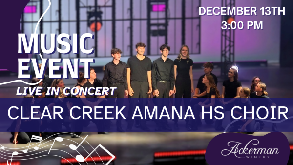 Saturday, December 13th at 3 pm, come and experience the beautiful and powerful voices of the Clear Creek Amana HS Kids Choir, as they sing a concert of Christmas Carols. (FREE EVENT)