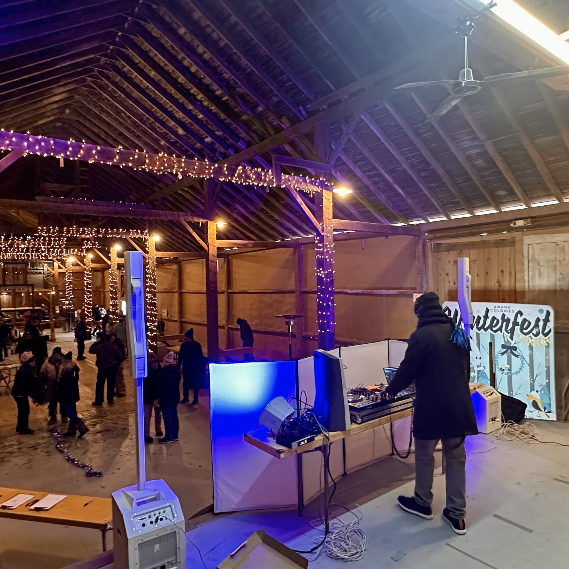 The Festhalle Barn is transformed into a glowing holiday wonderland, filled with twinkling lights, seasonal décor, and the unmistakable charm of Christmas in the Amana Colonies.